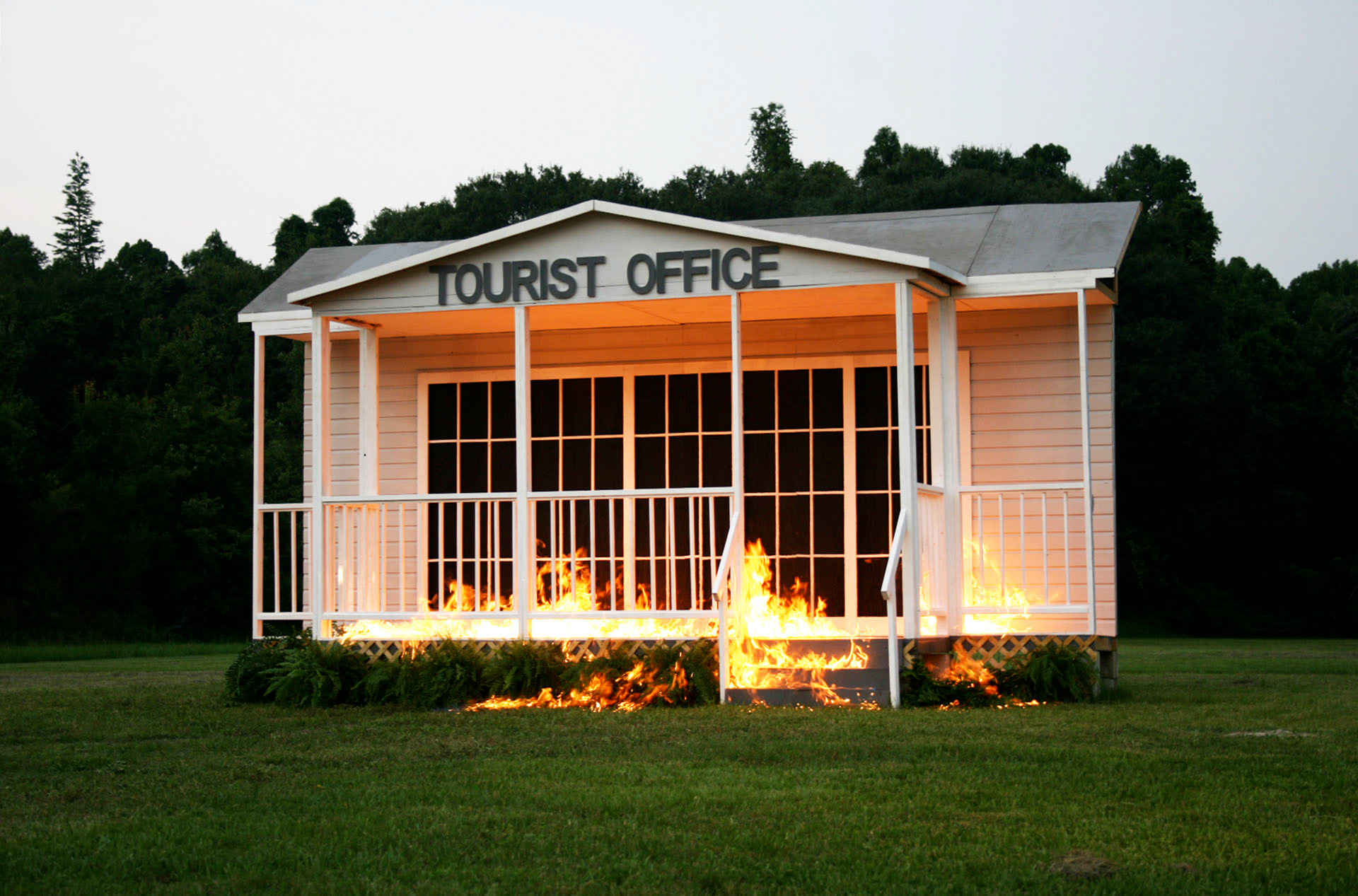 La façade a été démontée puis transportée dans l'espace d'exposition. Ce que les spectateurs voient est le véritable artefact d'un faux office de tourisme qui a réellement brûlé, et la vraie documentation d'un faux événement.